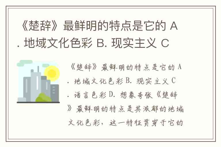《楚辞》最鲜明的特点是它的 A. 地域文化色彩 B. 现实主义 C. 语言色彩 D. 想象夸张