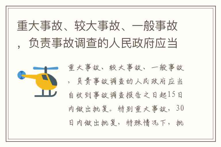 重大事故、较大事故、一般事故,负责事故调查的人民政府应当自收到事故调查报告之日起15日内做出批复。特别重大事故,30日内做出批复,特殊情况下,批复时间可以延长,但延长的时间最长不超过30日。