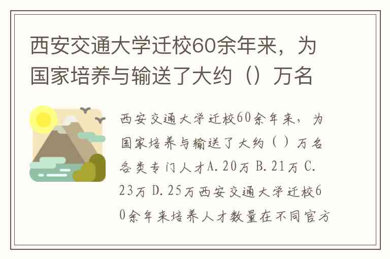 西安交通大学迁校60余年来,为国家培养与输送了大约()万名各类专门人才A.20万 B.21万 C.23万 D.25万