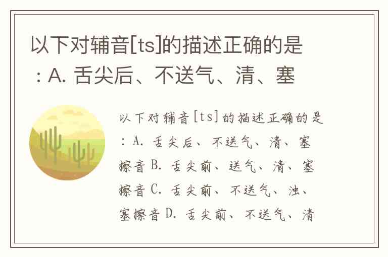 以下对辅音[ts]的描述正确的是 : A. 舌尖后、不送气、清、塞擦音 B. 舌尖前、送气、清、塞擦音 C. 舌尖前、不送气、浊、塞擦音 D. 舌尖前、不送气、清、塞擦音