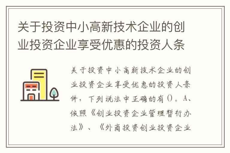 投资中小高新技术企业的创业投资企业享受税收优惠需满足多维度条件,涵盖设立依据、工商登记、备案规范等核心要求。以下结合政策文件对各选项的适用性分析如下: