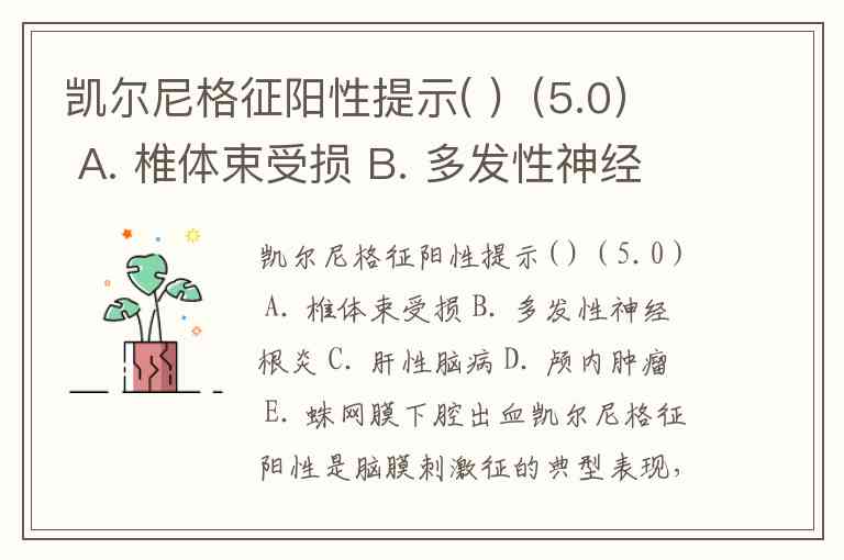 凯尔尼格征阳性提示( )(5.0) A. 椎体束受损 B. 多发性神经根炎 C. 肝性脑病 D. 颅内肿瘤 E. 蛛网膜下腔出血