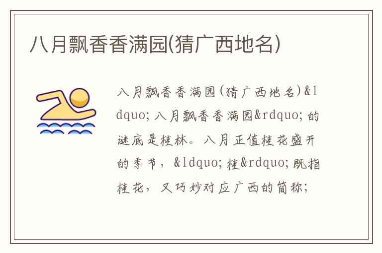 “八月飘香香满园”的谜底是桂林。八月正值桂花盛开的季节,“桂”既指桂花,又巧妙对应广西的简称;“林”则呼应“满园”的意境,描绘出桂花成林、香气弥漫的景象。桂林作为广西著名旅游城市,以山水甲天下闻名,而桂花也是桂林的市花,这一地名与谜面形成了完美呼应。你还能想到哪些以植物或季节特征为线索的地名谜语呢?