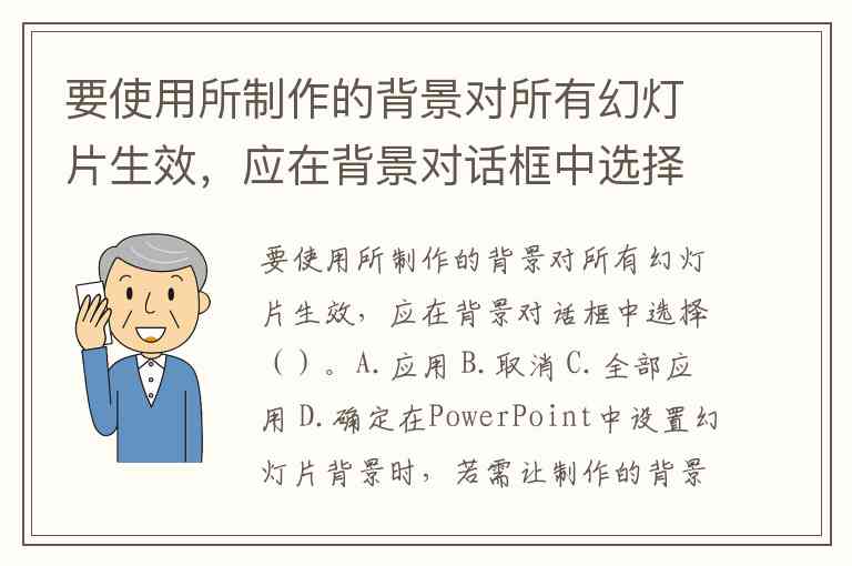 要使用所制作的背景对所有幻灯片生效,应在背景对话框中选择()。A.应用 B.取消 C.全部应用 D.确定