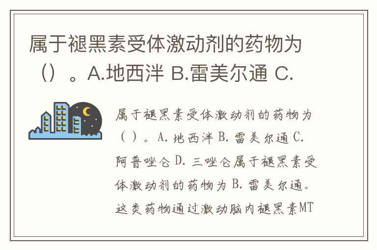 属于褪黑素受体激动剂的药物为()。A.地西泮 B.雷美尔通 C.阿普唑仑 D.三唑仑
