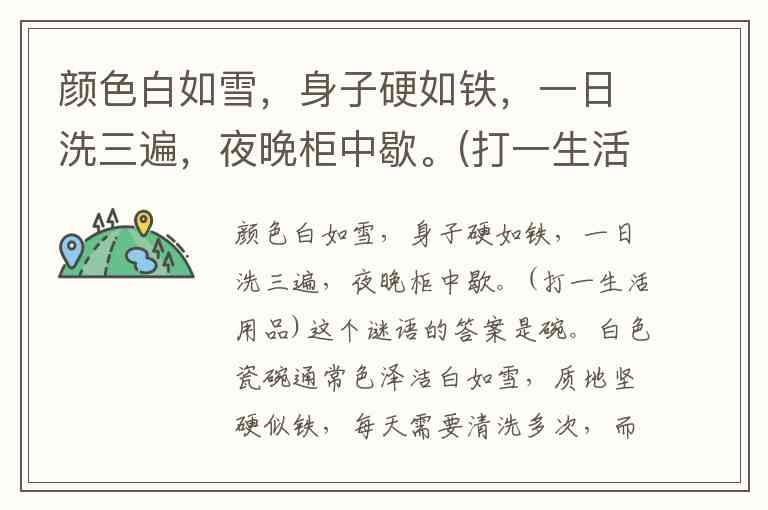 这个谜语的答案是碗。白色瓷碗通常色泽洁白如雪,质地坚硬似铁,每天需要清洗多次,而到了晚上不用时就会被收进橱柜里歇息。这些特征与谜语描述完全吻合,是日常生活中常见的餐具。