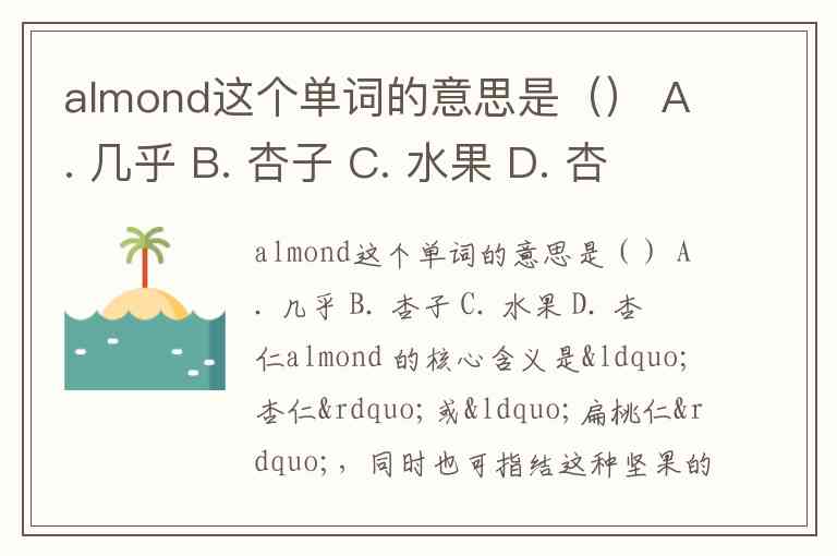 almond这个单词的意思是() A. 几乎 B. 杏子 C. 水果 D. 杏仁