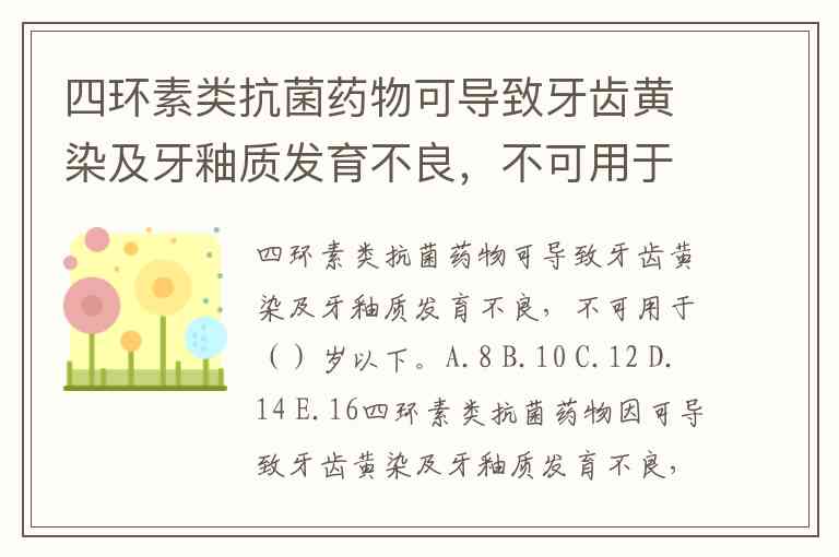 四环素类抗菌药物因可导致牙齿黄染及牙釉质发育不良,不可用于8岁以下儿童。这一禁忌基于药物与牙齿发育的关键机制:四环素类药物脂溶性强,会与骨骼和牙齿发育中沉积的钙结合,形成黄色的四环素-正磷酸钙复合物,永久沉积于牙本质,导致牙齿变色(从黄色到灰褐色),同时抑制牙釉质矿化,造成牙釉质发育不全。