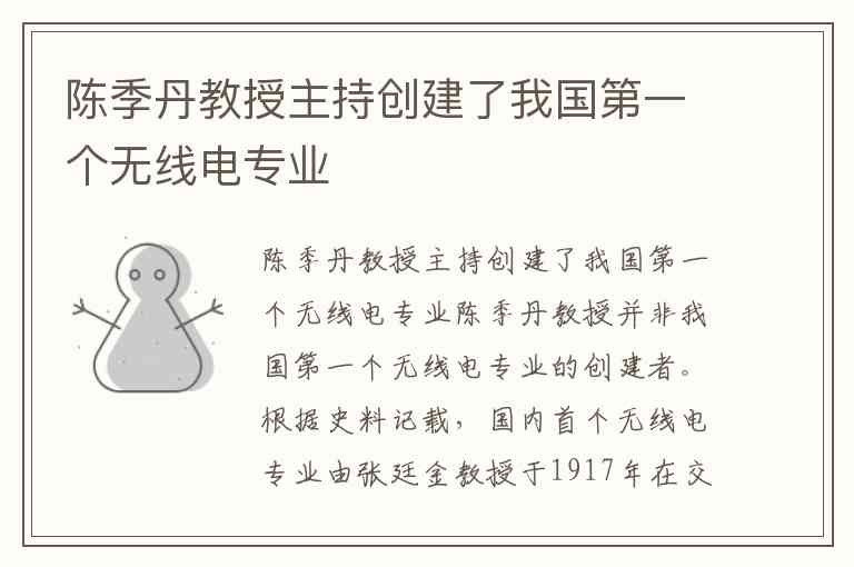 陈季丹教授并非我国第一个无线电专业的创建者。根据史料记载,国内首个无线电专业由张廷金教授于1917年在交通大学前身南洋大学创办,他主讲“无线电原理”课程并于1919年建成国内高校首个无线电试验室,培养出的学生曾被胡宗南部队点名参与无线电台建设。