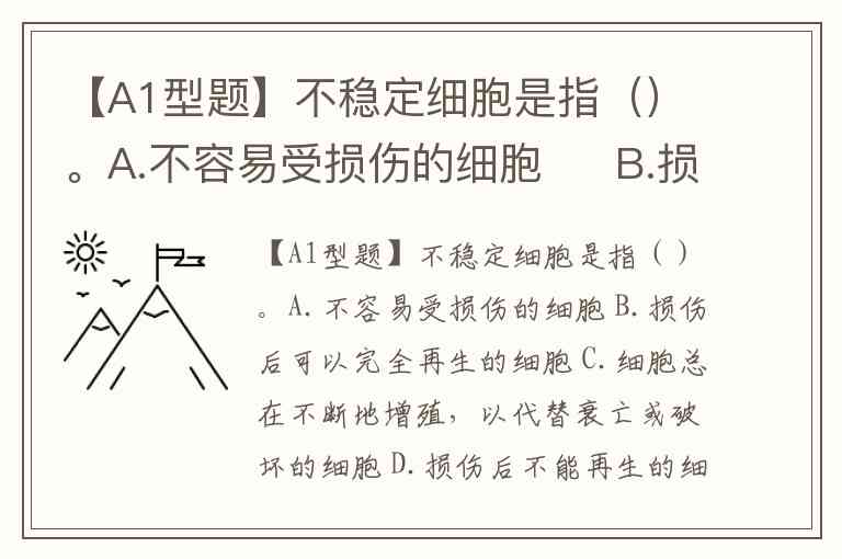 【A1型题】不稳定细胞是指()。A.不容易受损伤的细胞 B.损伤后可以完全再生的细胞 C.细胞总在不断地增殖,以代替衰亡或破坏的细胞 D.损伤后不能再生的细胞 E.损伤后细胞变化大