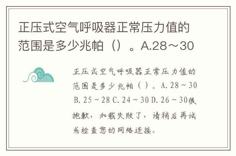 正压式空气呼吸器正常压力值的范围是多少兆帕()。A.28~30 B.25~28 C.24~30 D.26~30