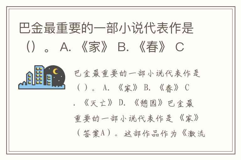 巴金最重要的一部小说代表作是 《家》(答案A)。这部作品作为《激流三部曲》的开篇之作,不仅奠定了巴金在中国现代文学史上的地位,更成为中国反封建文学的里程碑。它以成都封建大家庭高家为缩影,通过觉慧、觉新等青年的命运纠葛,控诉了封建礼教对人性的摧残,歌颂了新一代知识分子的觉醒与反抗。