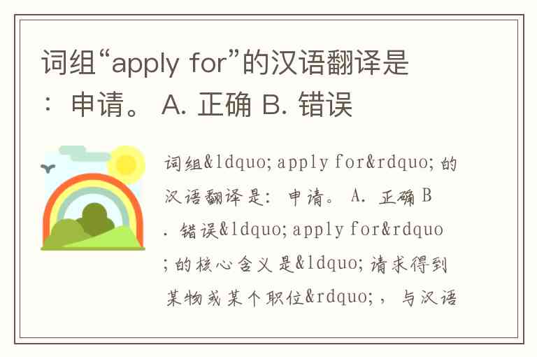 词组“apply for”的汉语翻译是:申请。 A. 正确 B. 错误