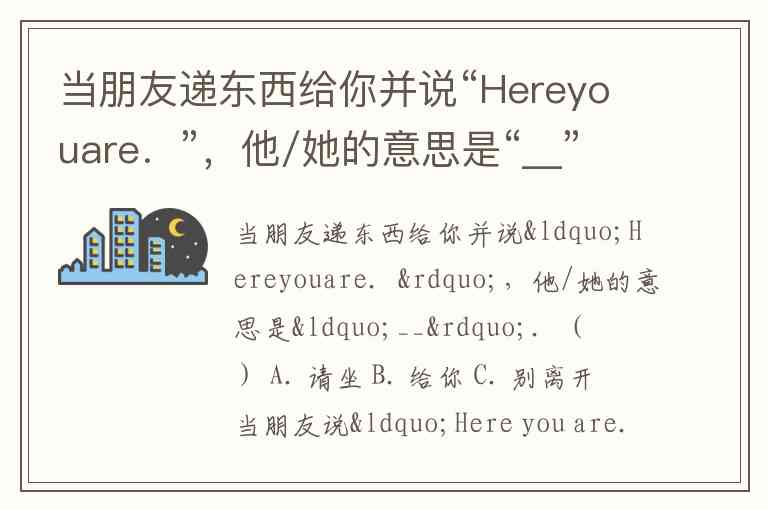 当朋友递东西给你并说“Hereyouare.”,他/她的意思是“__”.( ) A. 请坐 B. 给你 C. 别离开