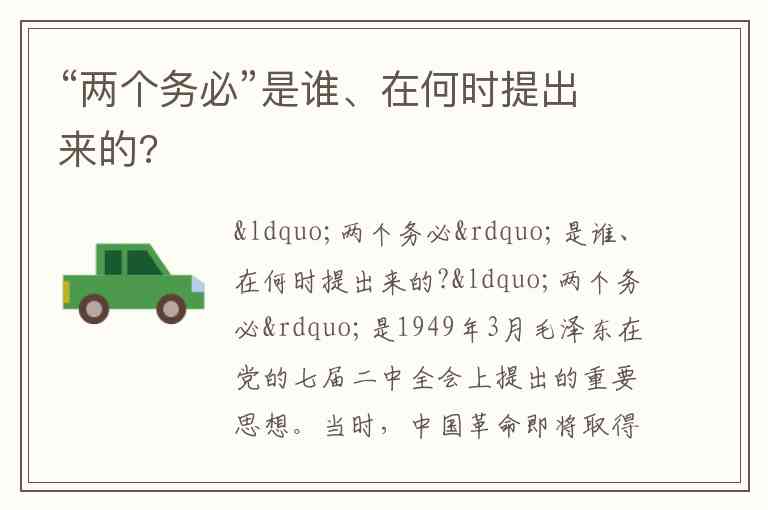 “两个务必”是1949年3月毛泽东在党的七届二中全会上提出的重要思想。当时,中国革命即将取得全国胜利,党的工作重心面临从乡村转向城市的重大转变,毛泽东在会议上郑重告诫全党:“务必使同志们继续地保持谦虚、谨慎、不骄、不躁的作风,务必使同志们继续地保持艰苦奋斗的作风。”