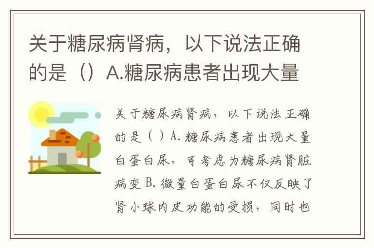 关于糖尿病肾病的正确说法是B、C、D。其中,糖尿病患者出现大量白蛋白尿需结合临床背景综合判断(A选项不准确),而微量白蛋白尿可反映全身血管内皮损伤,RAAS阻断剂是降压首选且需监测肾功能与血钾。