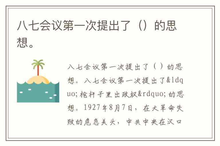 八七会议第一次提出了“枪杆子里出政权”的思想。1927年8月7日,在大革命失败的危急关头,中共中央在汉口召开紧急会议,毛泽东在发言中尖锐批判了陈独秀放弃军事领导权的右倾错误,明确指出“以后要非常注意军事,须知政权是由枪杆子中取得的”。这一论断从中国革命血的教训中提炼而来,首次将武装斗争与政权夺取直接关联,为正处于思想混乱的中国共产党指明了以军事斗争夺取政权的新方向。