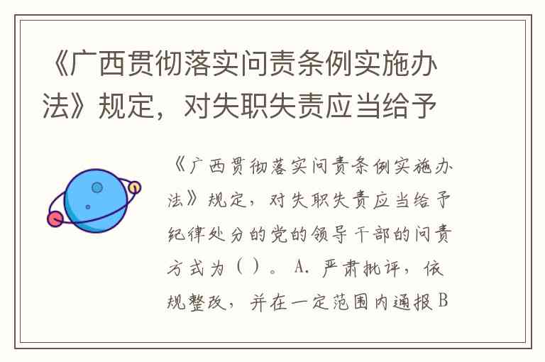 根据《广西贯彻落实问责条例实施办法》,对失职失责应当给予纪律处分的党的领导干部,其问责方式明确规定为"依照《中国共产党纪律处分条例》追究纪律责任"。这一规定对应问责体系中的第四种方式,适用于需要以党纪处分强化惩戒效果的情形。