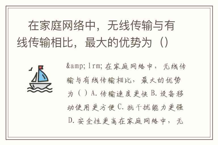 在家庭网络中,无线传输与有线传输相比,最大的优势为()A.传输速度更快 B.设备移动使用更方便 C.抗干扰能力更强 D.安全性更高