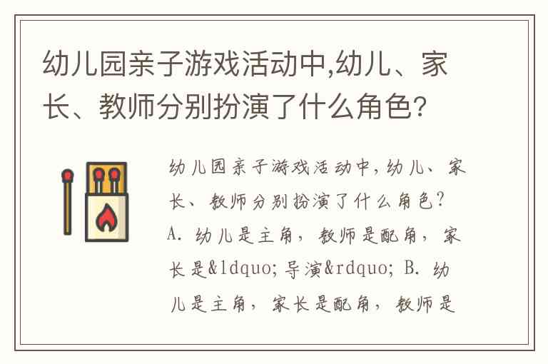 幼儿园亲子游戏活动中,幼儿、家长、教师分别扮演了什么角色? A. 幼儿是主角,教师是配角,家长是“导演” B. 幼儿是主角,家长是配角,教师是“导演” C. 幼儿是主角,家长是观众,教师是“导演” D. 幼儿是主角,教师是配角,家长是观众