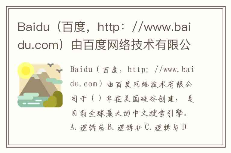 Baidu(百度,http://www.baidu.com)由百度网络技术有限公司于()年在美国硅谷创建, 是目前全球最大的中文搜索引擎。A.逻辑或 B.逻辑非 C.逻辑与 D.优先