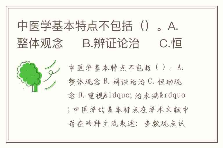 中医学的基本特点在学术文献中存在两种主流表述:多数观点认为是整体观念和辨证论治两大核心特点,部分文献则在此基础上增加恒动观念,构成三大特点。无论哪种分类,“治未病”均不属于基本特点范畴,而是中医预防医学思想的体现。