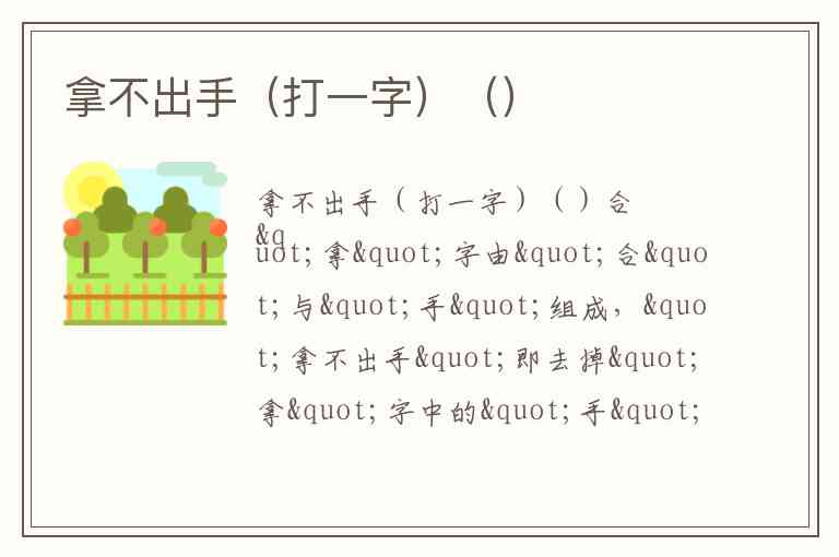 合"拿"字由"合"与"手"组成,"拿不出手"即去掉"拿"字中的"手"部,剩余部分为"合"。这个字谜巧妙利用汉字结构拆分,通过"不出手"的提示引导拆解原字,展现了汉字形义结合的趣味。你还能想到哪些通过部件增减构成的字谜呢?