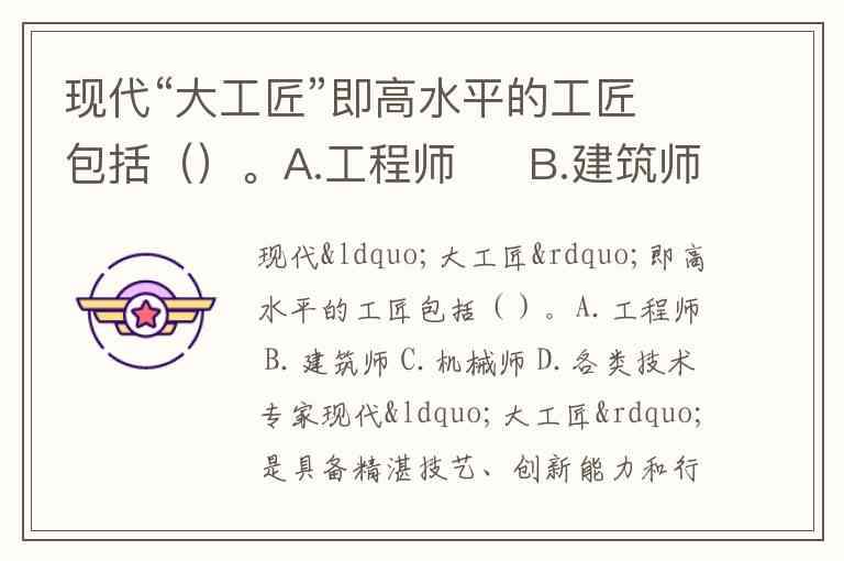 现代“大工匠”是具备精湛技艺、创新能力和行业影响力的高水平技术人才,其范畴已从传统手工业者扩展到现代工业各领域。根据题目选项及对工匠精神的现代诠释,正确答案为 A.工程师、B.建筑师、C.机械师、D.各类技术专家。