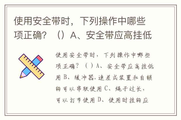 在使用安全带时,仅A项“安全带应高挂低用”是正确操作。这一原则通过将安全带固定点设置在高于作业位置的牢固处,能显著缩短坠落时的冲击距离,减少对人体的伤害。例如,高处作业时若安全带低挂高用,坠落时产生的冲击力会增大3-5倍,可能导致腰椎或内脏损伤。