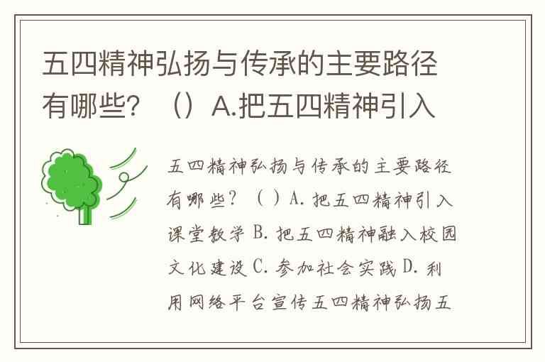 五四精神弘扬与传承的主要路径有哪些?()A.把五四精神引入课堂教学 B.把五四精神融入校园文化建设 C.参加社会实践 D.利用网络平台宣传五四精神