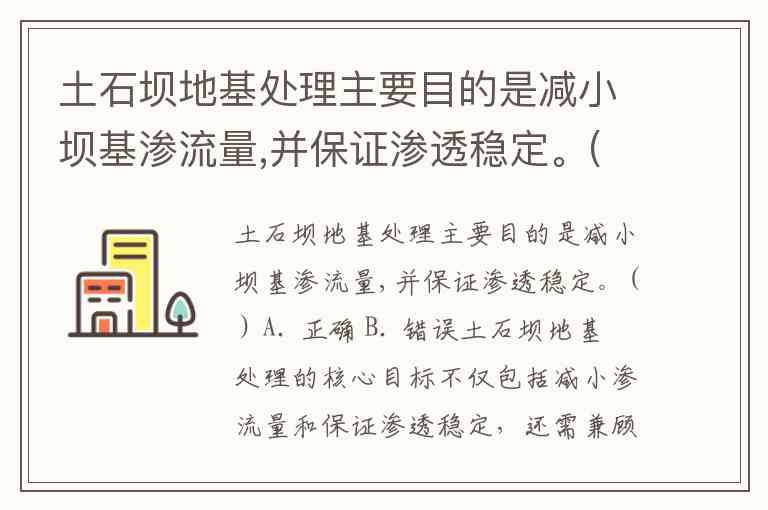 土石坝地基处理主要目的是减小坝基渗流量,并保证渗透稳定。( ) A. 正确 B. 错误