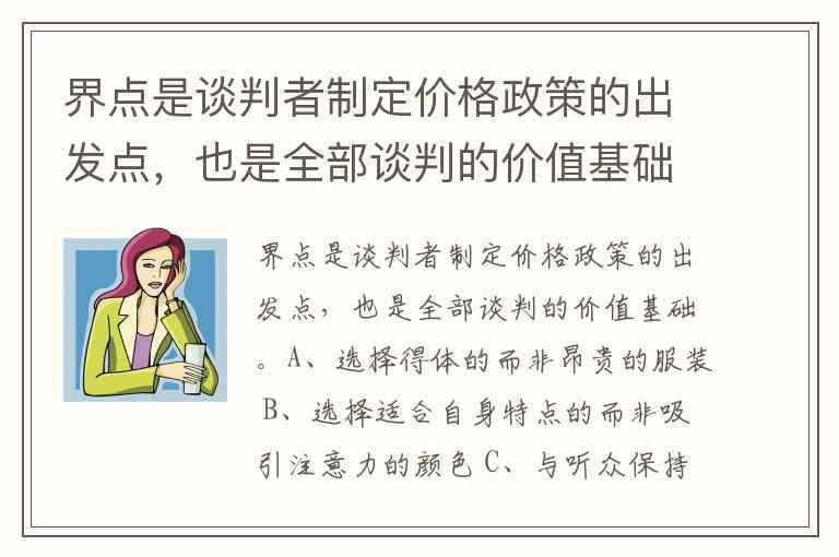 界点是谈判者制定价格政策的出发点,也是全部谈判的价值基础。A、选择得体的而非昂贵的服装 B、选择适合自身特点的而非吸引注意力的颜色 C、与听众保持距离而非打成一片 D、预先设想可能存在的意外而非什么都不考虑
