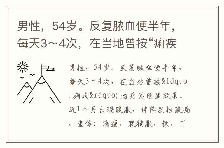 从临床逻辑看,患者54岁属结肠癌高发年龄段,慢性脓血便伴腹痛、腹部肿块及消瘦构成典型警示信号。当地按痢疾治疗无效,进一步排除感染性肠炎可能。结肠镜检查的独特优势在于:不仅可直观显示肿瘤大小、形态及浸润范围,还能对可疑病变即时取组织样本进行病理分析,而病理活检正是确诊癌症的“金标准”。相比之下,大便细菌培养主要用于感染性腹泻诊断,CT和B超更多用于评估肿瘤转移情况,钡餐检查对肠道微小病变的检出率明显低于肠镜。