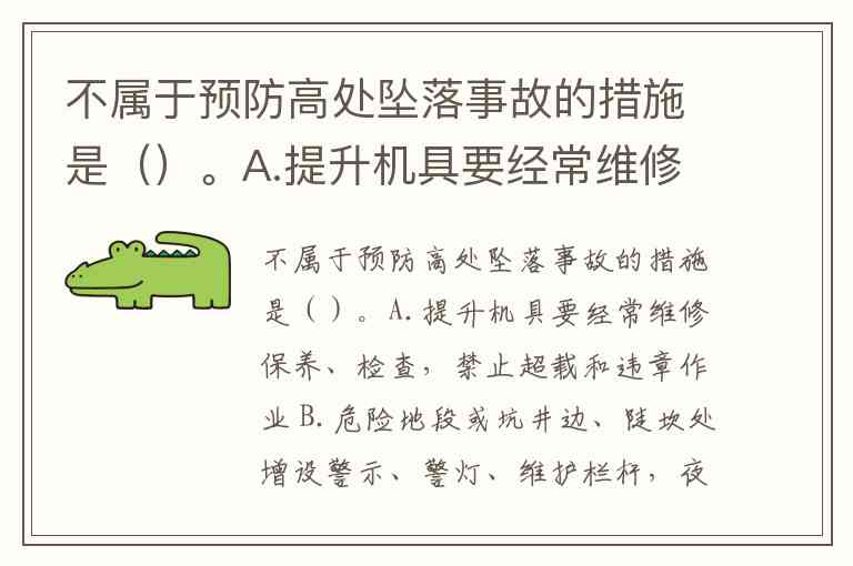 A选项:通过对提升机具(如起重机、脚手架等)的维护保养和规范操作,直接防止因设备故障或超载导致的高处坠落,属于典型预防措施。