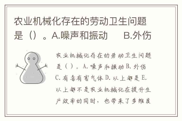 农业机械化存在的劳动卫生问题是()。A.噪声和振动 B.外伤 C.有毒有害气体 D.以上都是 E.以上都不是