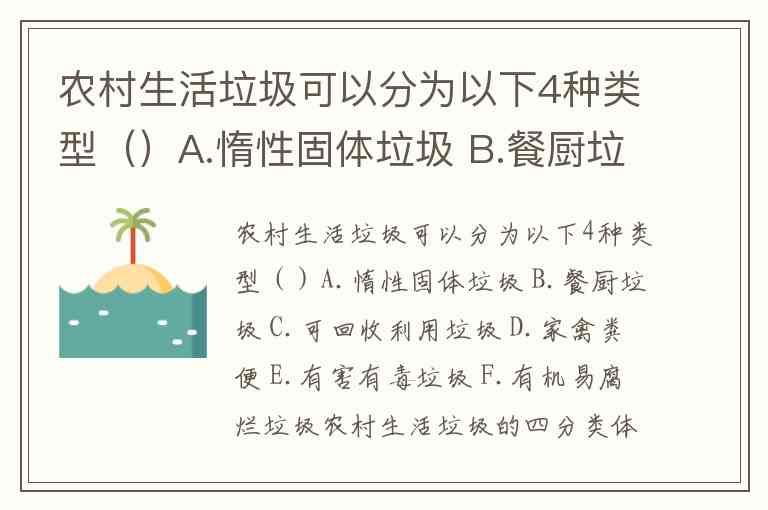农村生活垃圾可以分为以下4种类型()A.惰性固体垃圾 B.餐厨垃圾 C.可回收利用垃圾 D.家禽粪便 E.有害有毒垃圾 F.有机易腐烂垃圾