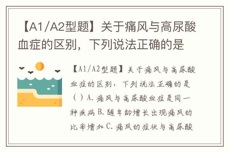 【A1/A2型题】关于痛风与高尿酸血症的区别,下列说法正确的是()A.痛风与高尿酸血症是同一种疾病 B.随年龄增长出现痛风的比率增加 C.痛风的症状与高尿酸血症水平无关 D.痛风与高尿酸血症持续时间无关 E.痛风多发生在女性