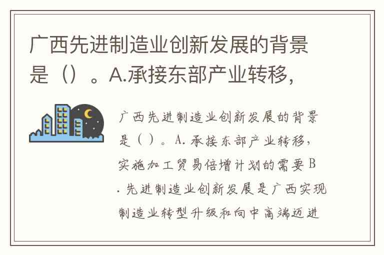 广西先进制造业创新发展的背景是()。A.承接东部产业转移,实施加工贸易倍增计划的需要 B.先进制造业创新发展是广西实现制造业转型升级和向中高端迈进的需要 C.加快推进中国—东盟货贸通道建设的需要 D.先进制造业创新发展是推动“广西制造”向“广西智造”转变的需要