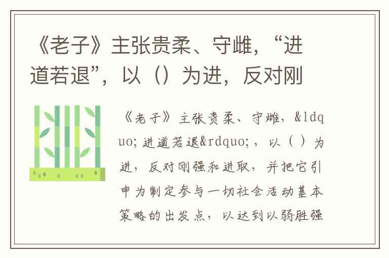 《老子》主张贵柔、守雌,“进道若退”,以()为进,反对刚强和进取,并把它引申为制定参与一切社会活动基本策略的出发点,以达到以弱胜强、以屈求伸的目的。A.退 B.攻 C.守