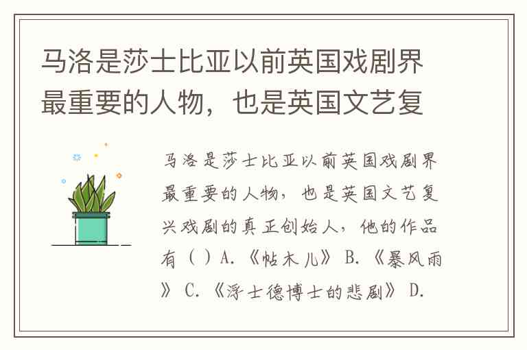 关于选项中的《阿尔及尔风习》,现有权威文献(如《马洛戏剧全集》)未将其列入马洛作品目录,而《暴风雨》明确为莎士比亚晚期传奇剧,故正确答案为 A、C、D。马洛虽仅活到29岁,但其六部完整戏剧(含历史剧《爱德华二世》等)构建了以“爱与恨、生与死、宗教与政治、哲学”为核心的思想体系,其对人物心理分析的探索和无韵诗体的成熟运用,被公认为“为莎士比亚的创作铺平了道路”。