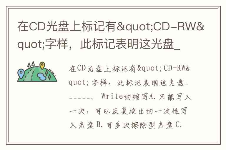 在CD光盘上标记有"CD-RW"字样,此标记表明这光盘______。 Write的缩写A.只能写入一次,可以反复读出的一次性写入光盘 B.可多次擦除型光盘 C.只能读出,不能写入的只读光盘 D.RW是Readand