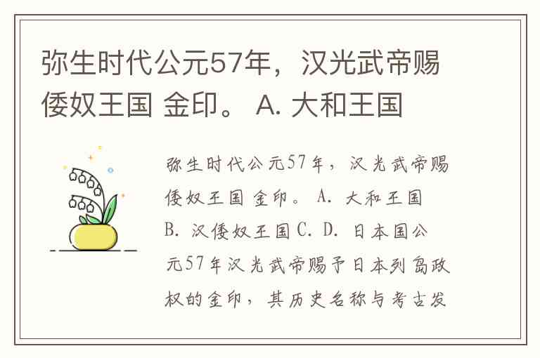 弥生时代公元57年,汉光武帝赐倭奴王国 金印。 A. 大和王国 B. 汉倭奴王国 C. D. 日本国