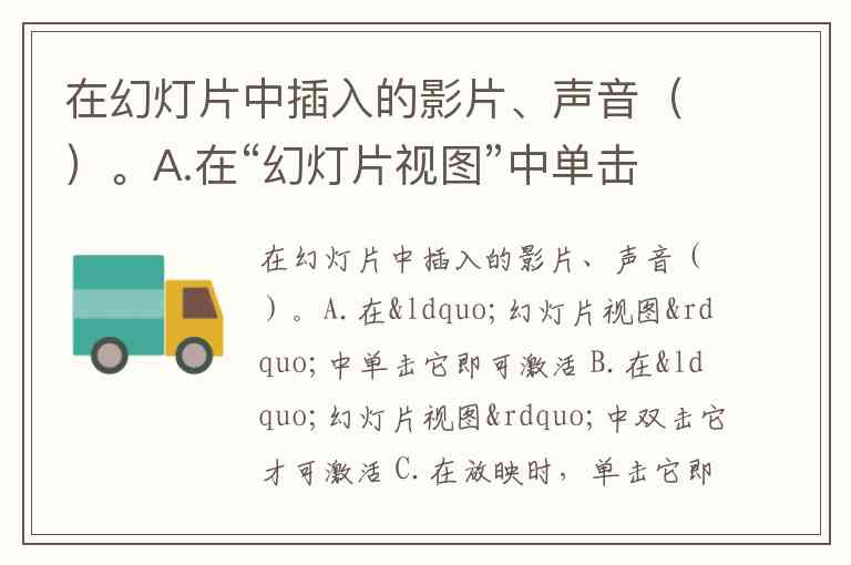 在幻灯片中插入的影片、声音()。A.在“幻灯片视图”中单击它即可激活 B.在“幻灯片视图”中双击它才可激活 C.在放映时,单击它即可激活 D.在放映时,双击它才可激活