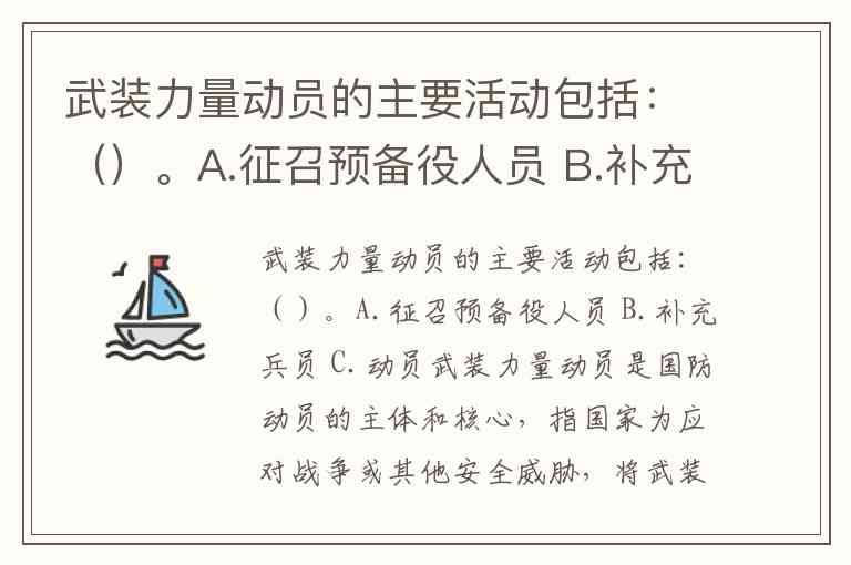 值得注意的是,选项C“动员”本身是上位概念,而非具体活动类型。武装力量动员作为国防动员的组成部分,其具体实施正是通过征召预备役人员、补充兵员等操作性活动完成的。这种层次关系决定了“动员”不能与前两项并列作为具体活动内容。