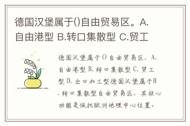 德国汉堡属于()自由贸易区。A.自由港型 B.转口集散型 C.贸工型 D.出口加工型