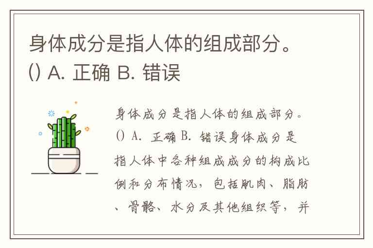 身体成分是指人体中各种组成成分的构成比例和分布情况,包括肌肉、脂肪、骨骼、水分及其他组织等,并非简单指人体的组成部分。这一概念更强调各成分之间的量化关系,而非笼统的组成部分。答案选B.错误。理解身体成分的科学定义,有助于更精准地评估健康状况和制定 fitness 计划,你平时会通过哪些方式关注自己的身体成分呢?