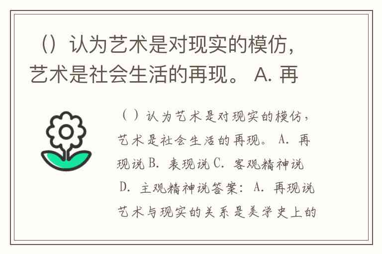 ()认为艺术是对现实的模仿,艺术是社会生活的再现。 A. 再现说 B. 表现说 C. 客观精神说 D. 主观精神说