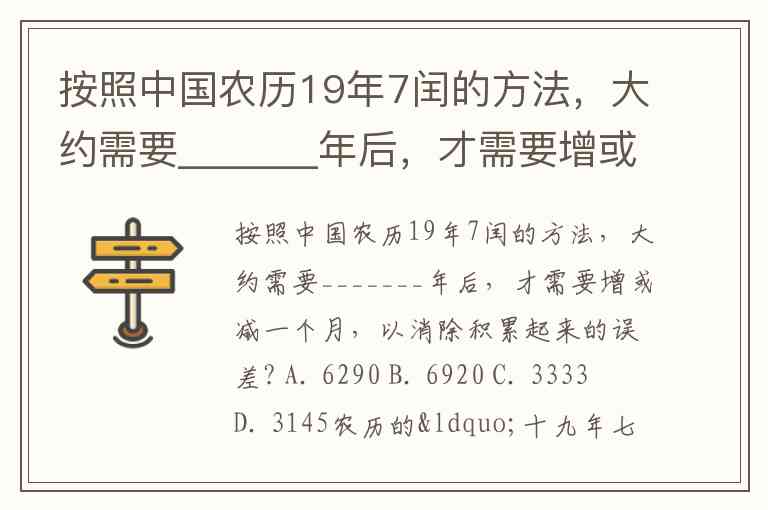 按照中国农历19年7闰的方法,大约需要_______年后,才需要增或减一个月,以消除积累起来的误差? A. 6290 B. 6920 C. 3333 D. 3145
