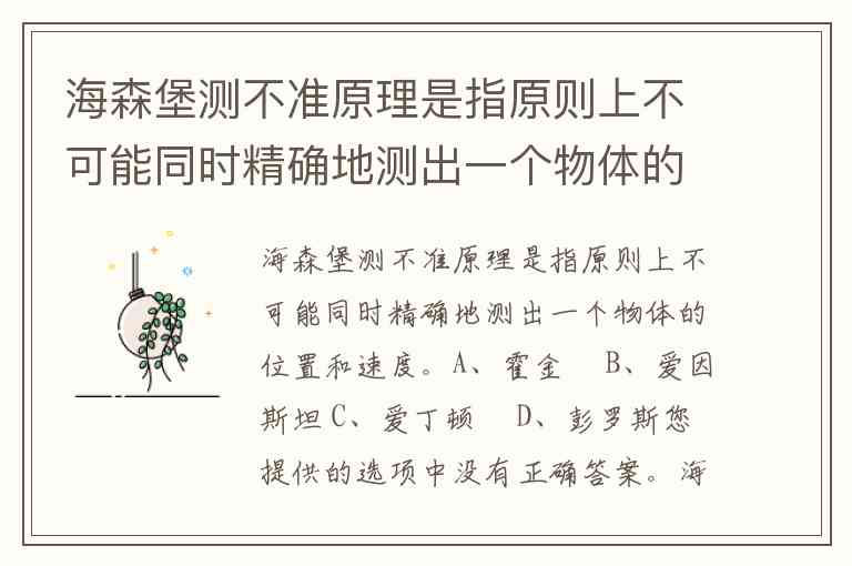 海森堡测不准原理是指原则上不可能同时精确地测出一个物体的位置和速度。A、霍金 B、爱因斯坦 C、爱丁顿 D、彭罗斯