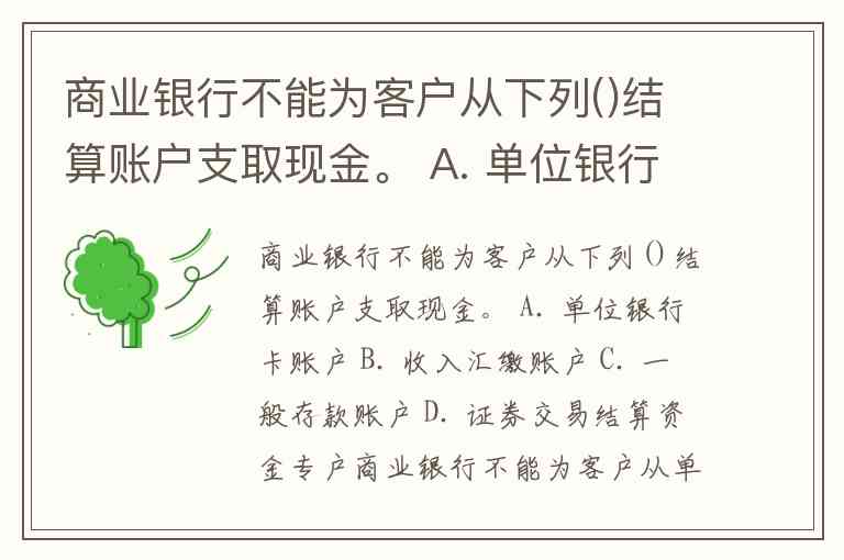 商业银行不能为客户从下列()结算账户支取现金。 A. 单位银行卡账户 B. 收入汇缴账户 C. 一般存款账户 D. 证券交易结算资金专户
